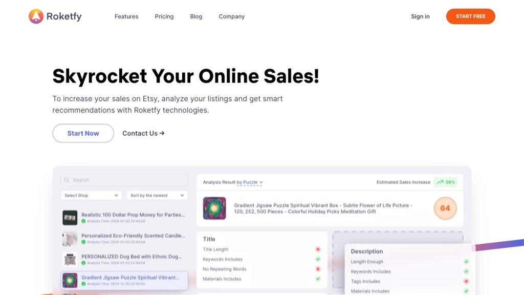 Roketfy es una plataforma diseñada para ayudar a los vendedores de Etsy a mejorar sus ventas mediante el uso de herramientas y servicios basados en datos. Esta plataforma ofrece una serie de funcionalidades que permiten a los vendedores optimizar sus listados, analizar el mercado y tomar decisiones informadas para aumentar su rentabilidad. A continuación, se detallan algunos de los aspectos más importantes de Roketfy.